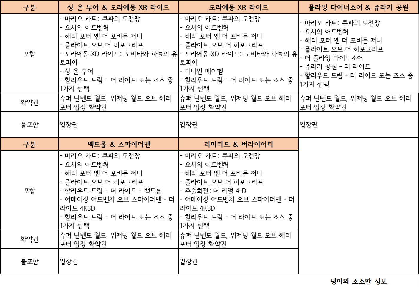 그리고 옵션 별로 포함 어트렉션 및 가격이 조금씩 다릅니다.